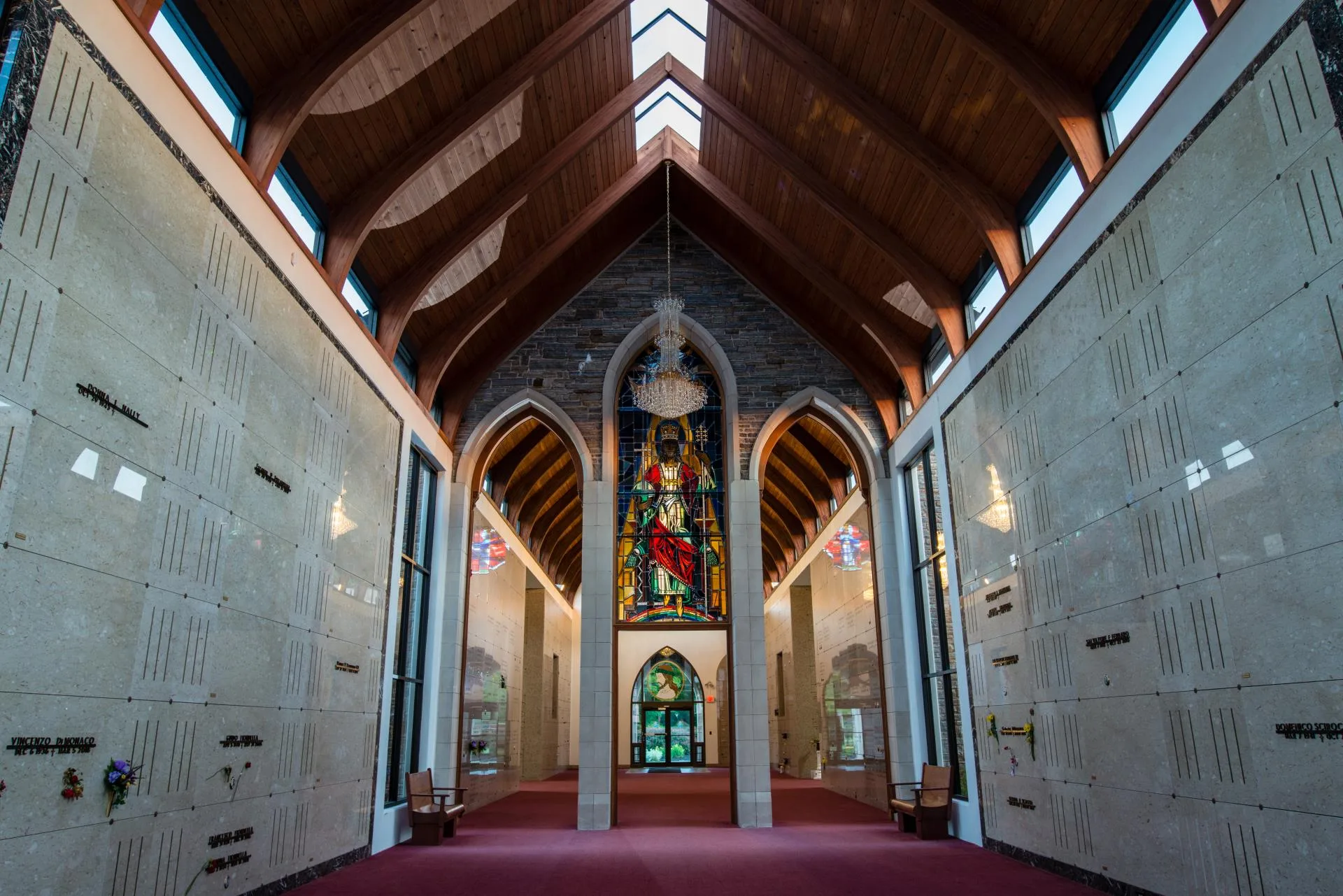 Across our ever-growing 100 acres of beautifully manicured property in North Haven, we offer shrines in honor of Our Lord, Jesus Christ, the Blessed Virgin Mary, and a variety of beloved Saints. One of our oldest sections is dedicated to Our Holy Mother, titled, Our Lady Queen of the Universe which is centrally located. Stations of the Cross monuments are individually placed over 20 acres and conclude with a Columbarium featuring a spectacular mosaic of Christ’s Resurrection. A short distance away, our Mausoleum offers over 4,500 crypt spaces and over 1,000 cremation niches in many styles and locations. Masses for Memorial Day, Our Lady Queen of the Rosary and All Souls Day are offered annually in our Mausoleum as well as monthly for all deceased members. Other events such as our Tuesday evening Rosary Walk begins in the summer and ends in the fall with a Procession in honor of the Blessed Virgin Mary. Our monument section provides a unique array of privately owned custom monuments as well as cemetery owned options.
